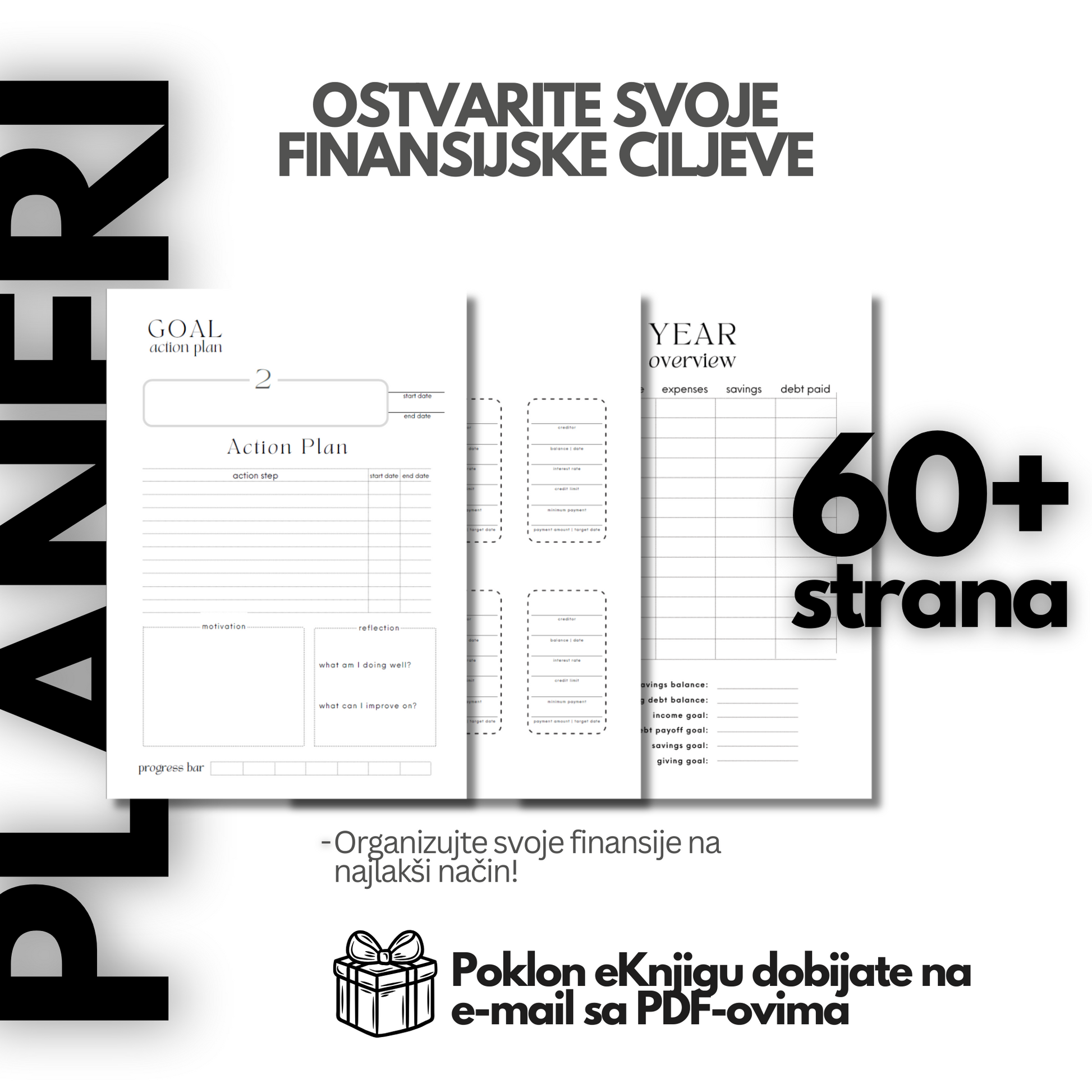 Više od 70 stranica planiranja! Dobijaš mesečne i nedeljne budžet tabele, praćenje troškova, ciljeve štednje i još mnogo toga – sve na jednom mestu.
